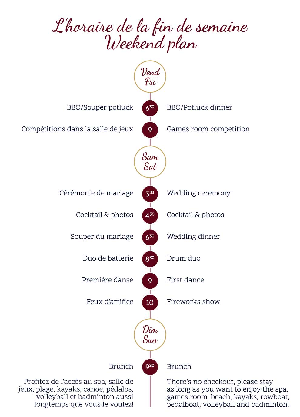 Bien qu’il y aura des employés sur les lieux lors du mariage, le Manoir Montpellier n’offre pas de services de réception ou de nettoyage des chambres lors de la fin de semaine. Chaque invité aura une serviette et des draps propres installés dans leur chambre le vendredi. On vous recommande d’apporter une serviette de plage si vous prévoyez utiliser le spa ou le lac.